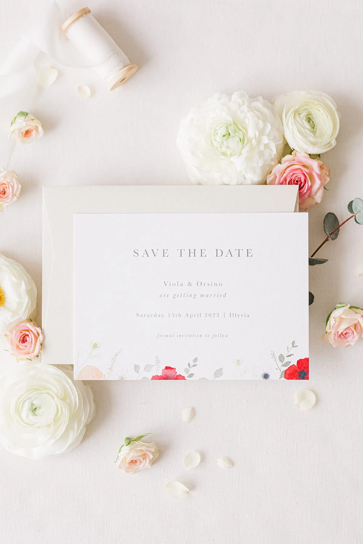 Save the dates are available in A6, 5x7'' or A5 size with a range of envelope colours to choose from.