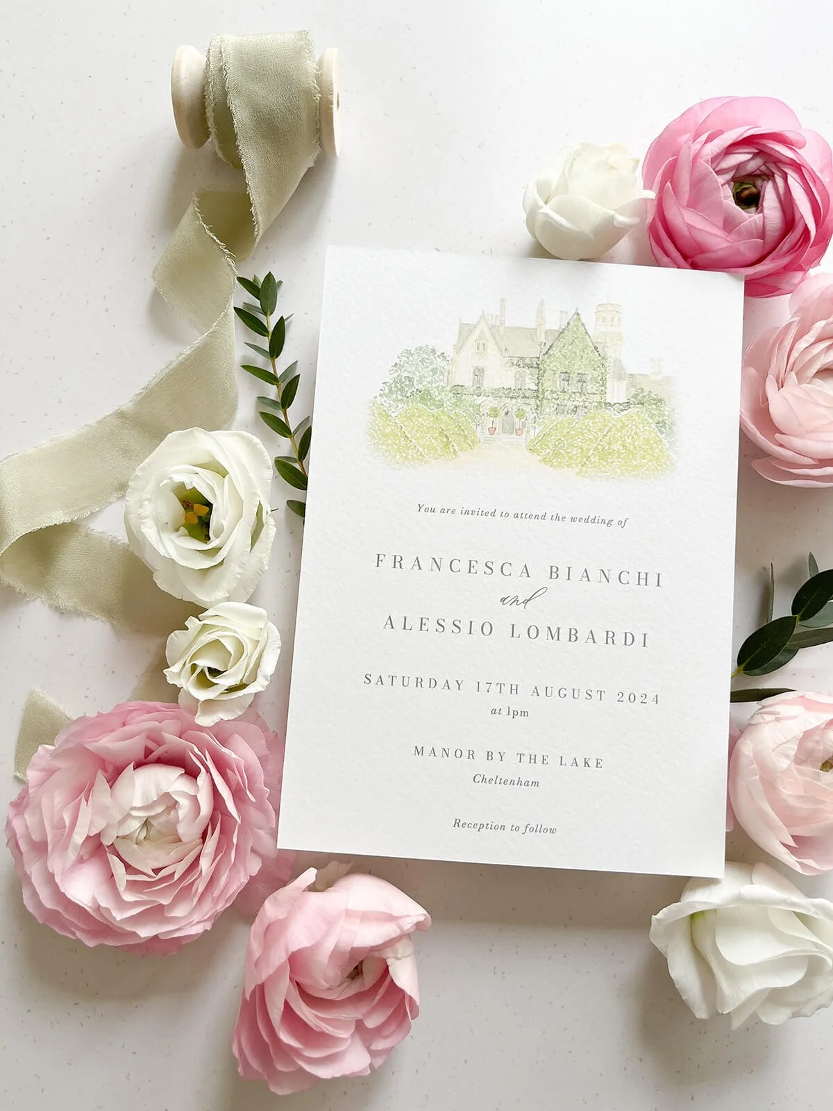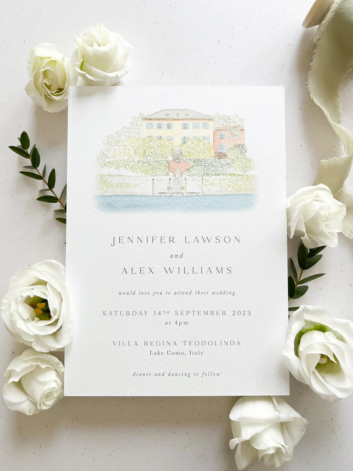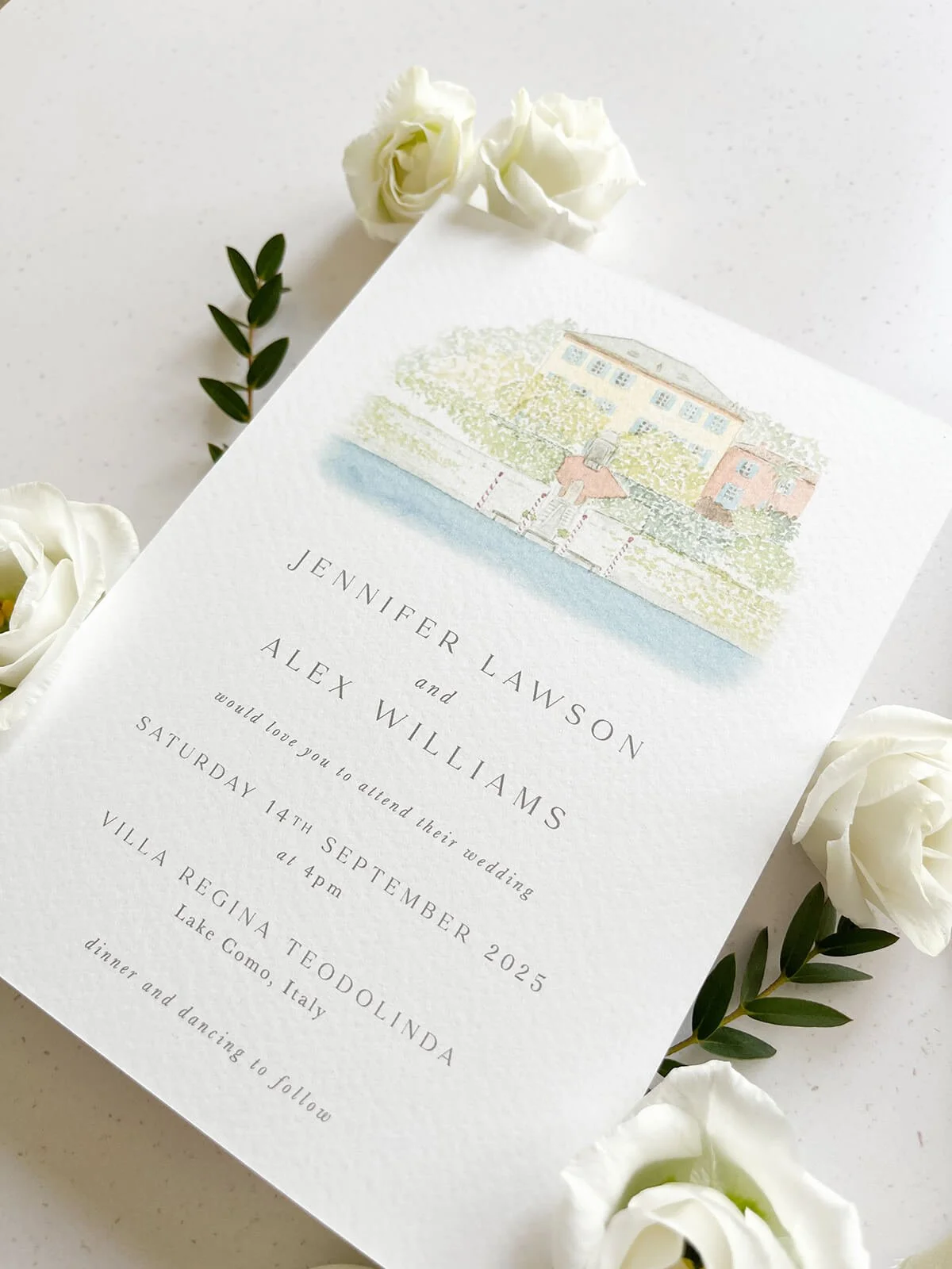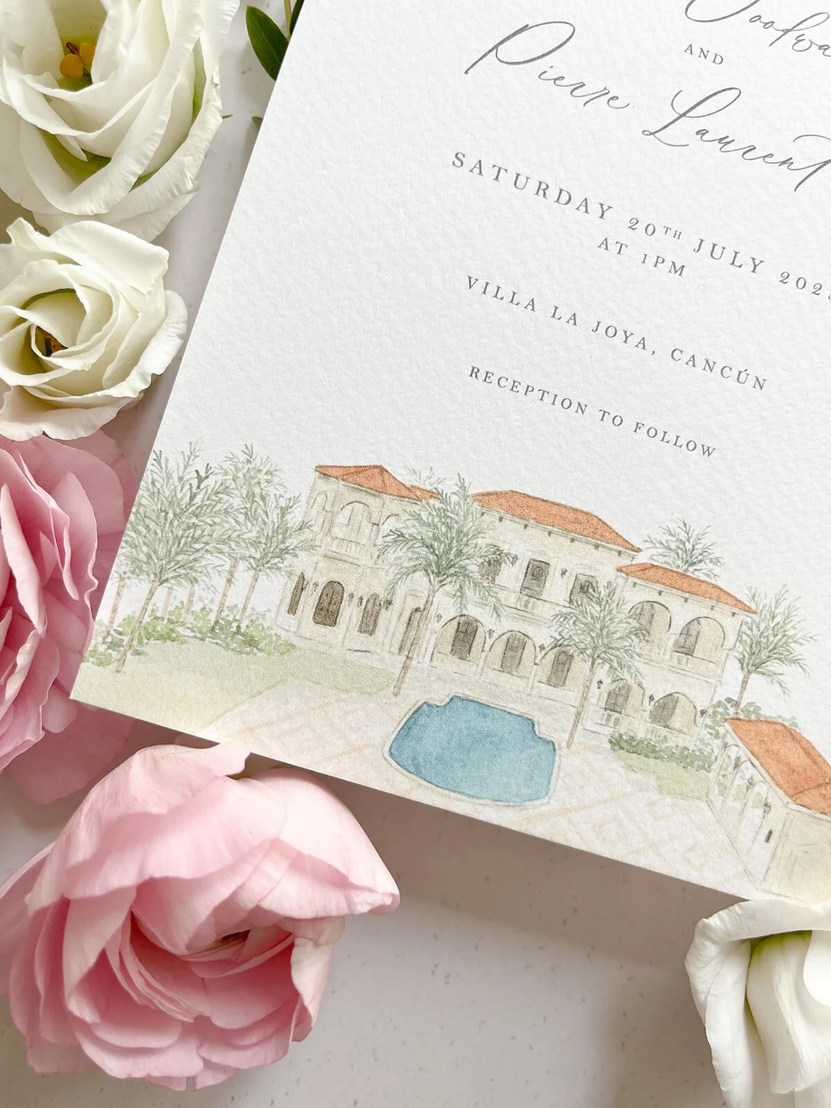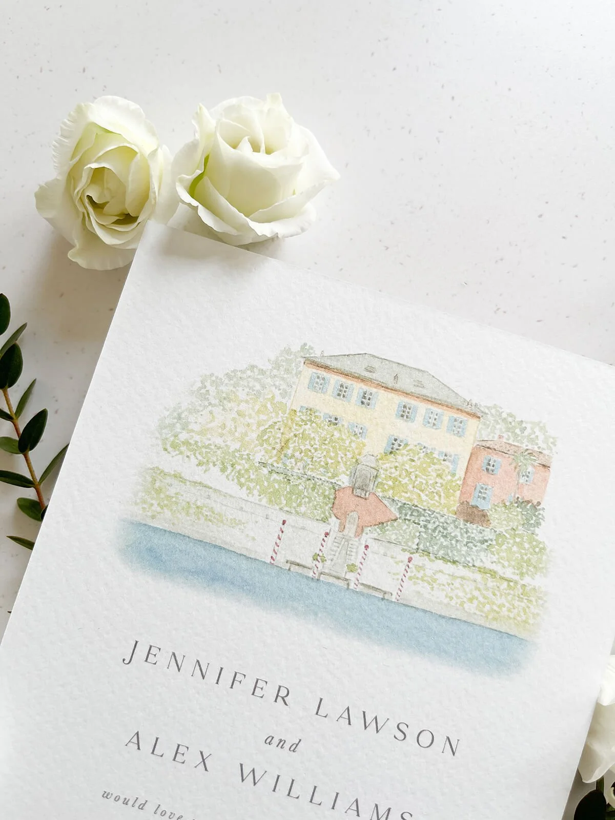 This romantic invitation features a watercolour illustration of the villa and a stylised script font.