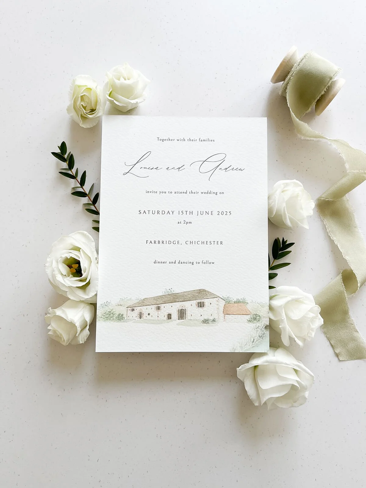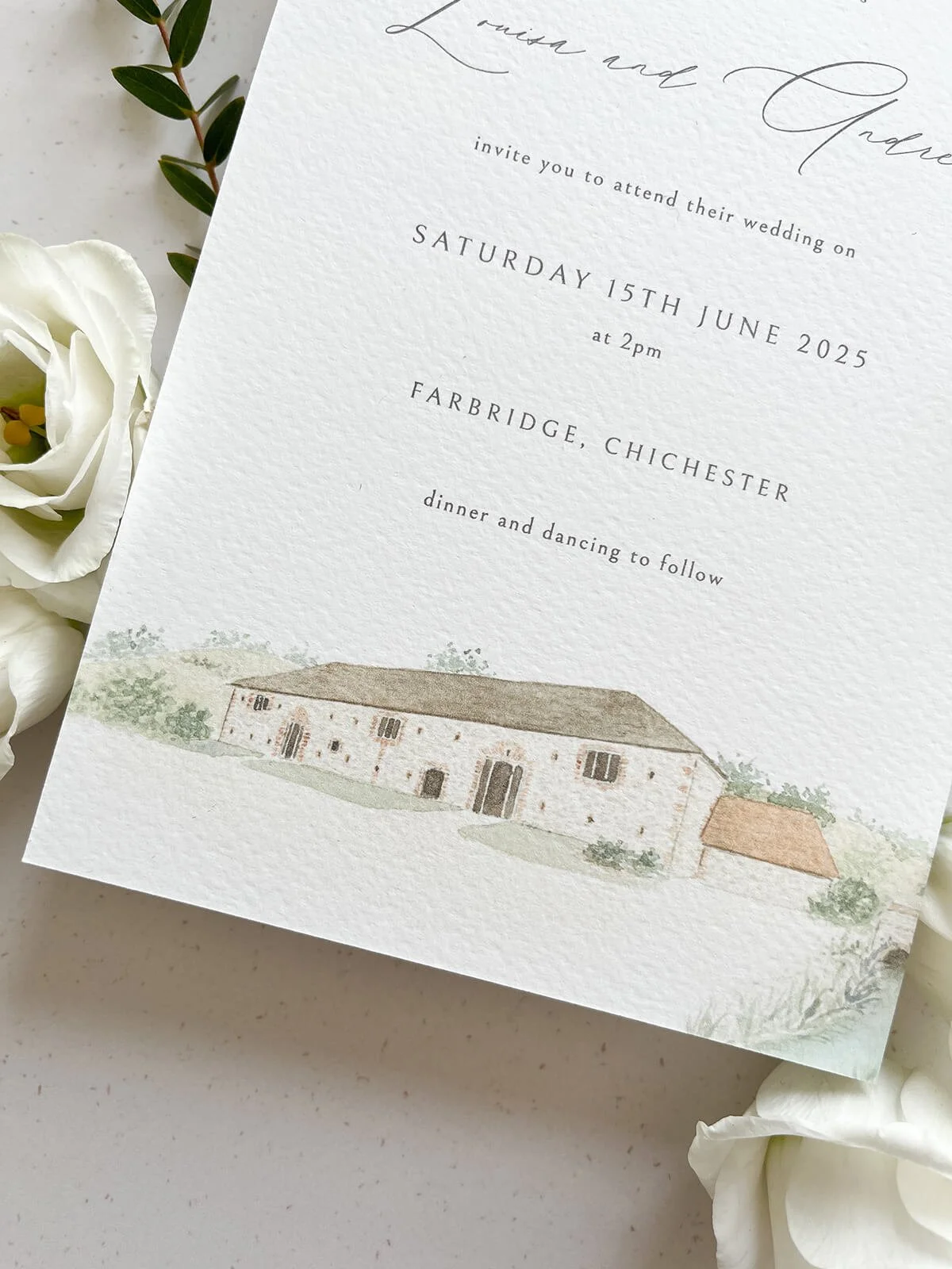 This classic invitation design features a watercolour illustration of the venue and sprawling fields, complemented by a modern calligraphy script font.