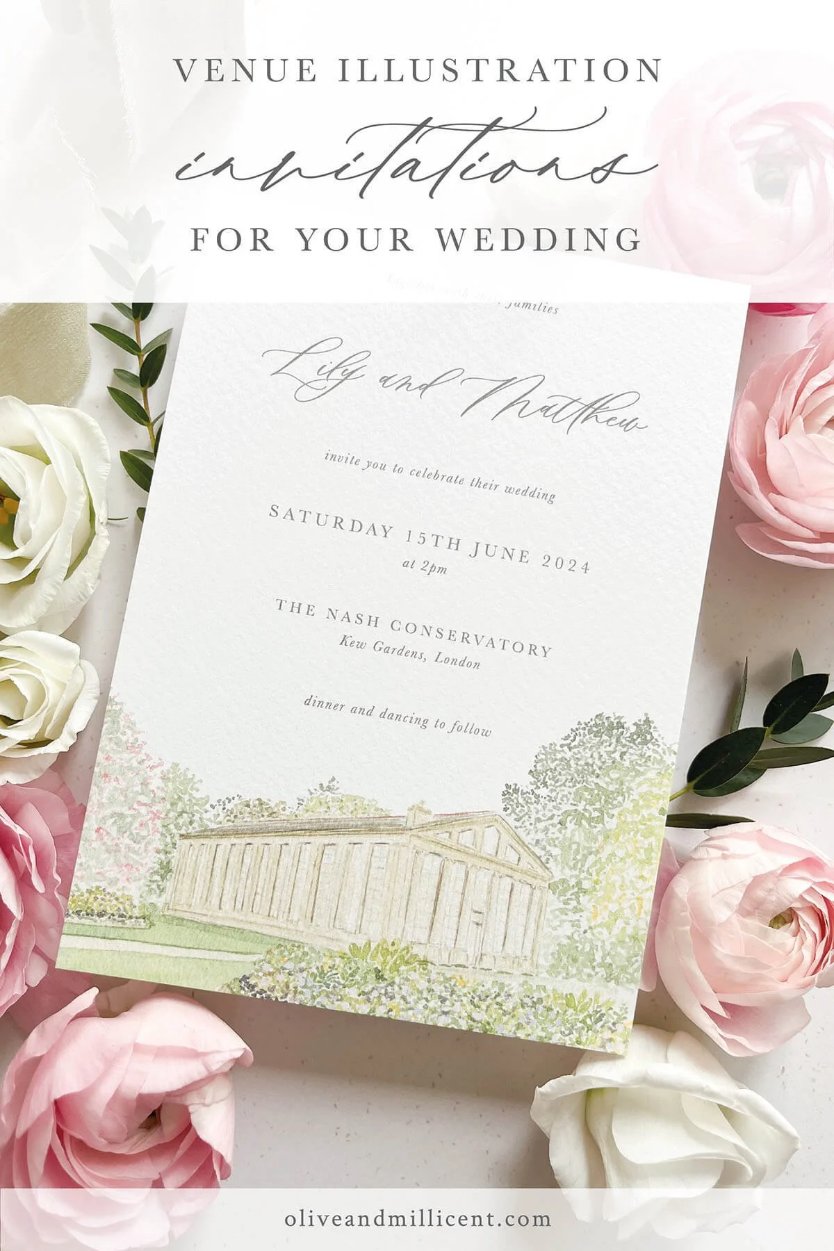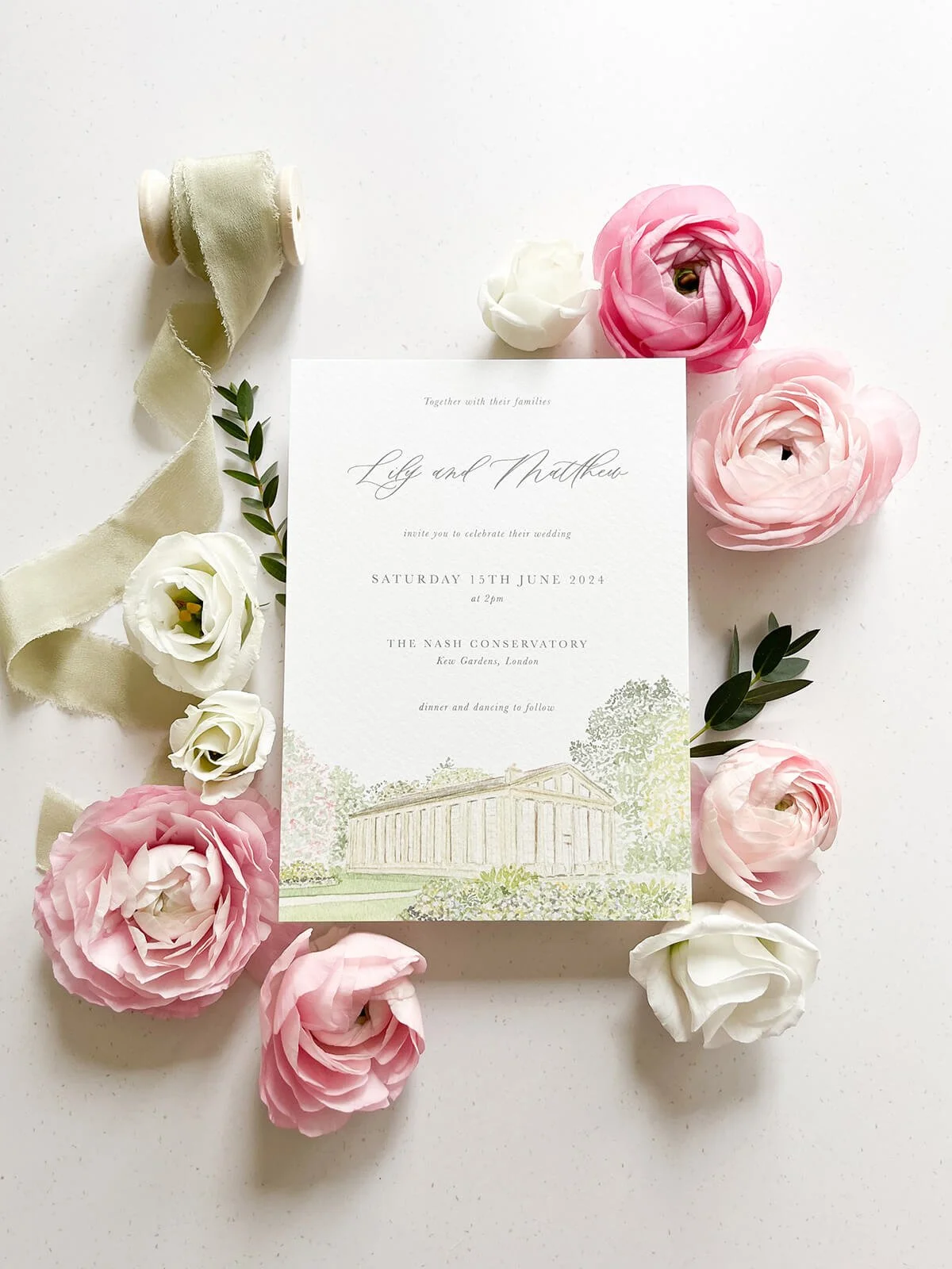 This invitation design features a watercolour illustration of Kew’s Nash Conservatory, complemented by a romantic calligraphy script.